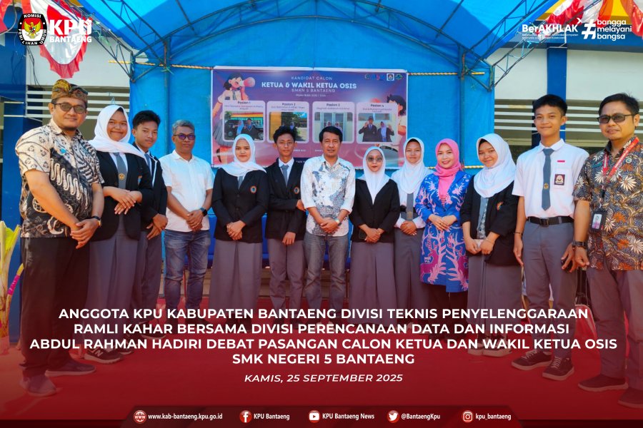 Bantaeng,-- Anggota Komisi Pemilihan Umum (KPU) Kabupaten Bantaeng Divisi Teknis Penyelenggaraan, Ramli Kahar Bersama Anggota KPU Bantaeng Divisi Perencanaan Data dan Informasi Abdul Rahman menghadiri kegiatan debat pasangan calon (Piketos) Pemilihan Ketua Osis di SMK Negeri 5 Bantaeng, Rabu(25/09/2025) Kegiatan ini disambut antusias oleh para siswa, guru, dan jajaran sekolah sebagai bagian dari proses pembelajaran demokrasi di lingkungan pendidikan. Dalam sambutannya, Ramli Kahar mengatakan, bahwa pemilihan Ketua Osis bukan sekadar seremonial, melainkan wadah penting bagi siswa untuk belajar berorganisasi dan menyalurkan aspirasi. “Pemilihan Ketua Osis ini menjadi wadah berhimpun siswa untuk mewakili mereka dalam berinteraksi dengan pihak guru di sekolah maupun dengan masyarakat. Yang terpilih nantinya harus mampu menjadi jembatan bagi suara dan aspirasi teman-teman siswa,” ujarnya. Ia menambahkan, Osis berperan strategis sebagai ruang demokratis yang dapat menampung gagasan dan ide-ide kreatif siswa. “Osis harus menjadi wadah untuk menghimpun aspirasi siswa, yang kemudian direalisasikan dalam bentuk program kerja. Dengan begitu, organisasi ini bukan hanya formalitas, tetapi benar-benar memberi manfaat nyata bagi seluruh siswa,” jelasnya. Lebih jauh, Ramli Kahar menekankan pentingnya sikap dewasa dalam menerima hasil pemilihan. Menurutnya, proses demokrasi di sekolah juga mengajarkan sportivitas dan rekonsiliasi. “Setelah pemilihan, ketua Osis dan seluruh pengurus harus segera melakukan rekonsiliasi. Bagi yang kalah jangan berkecil hati, begitu pun yang menang jangan jumawa. Semua harus kembali bersatu untuk kepentingan bersama,” katanya. Kegiatan debat ini diharapkan dapat melatih siswa dalam menyampaikan visi, misi, serta gagasan mereka secara terbuka dan argumentatif. Selain itu, pemilihan Osis dengan format seperti ini juga dianggap sebagai miniatur demokrasi yang mampu menumbuhkan budaya politik sehat sejak dini. ....