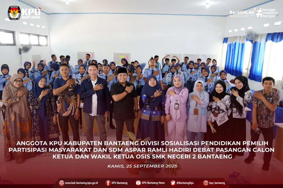 Bantaeng,-- Anggota KPU Kabupaten Bantaeng Divisi Sosialisasi Pendidikan Pemilih, Partisipasi Masyarakat dan SDM Aspar Ramli, hadir pada kegiatan Debat Pasangan Calon Ketua dan Wakil Ketua Osis serentak di SMA Negeri 2 Bantaeng, Kamis(25/09/2025). Dalam arahannya Aspar Ramli menekankan, bahwa debat pasangan calon Ketua dan Wakil Ketua Osis ini, bukan arena adu kuat semata, melainkan panggung untuk menunjukan kebijaksanaan dalam menyampaikan visi misi pasangan calon. "Debat pasangan calon ini bukan untuk mencari siapa yang benar, siapa yang paling jago, tetapi siapa yang paling bijak dan tepat dalam menyampaikan kebenaran didalam visi misinya," Ucap Aspar Aspar juga mengingatkan pentingnya memahami perbedaan pendapat sebagai sebuah kekayaan dalam berorganisasi. "Melalui giat debat ini, kita belajar bahwa perbedaan pendapat bukan untuk memecah belah, melainkan untuk memperkaya cara pandang. Karena seyogyanya pemimpin hebat lahir dari keberanian menyampaikan gagasan dan kerendahan hati mendengar gagasan orang lain," tambahnya Diketahui, empat pasangan calon yang beradu visi dan misi serta program yang dicanangkan. Turut hadir pada kegiatan ini, Kepala Sub Bagian Sosialisasi Pendidikan Pemilih, Partisipasi Masyarakat dan SDM, Muhammad Rusman, Plt Kepala Sekolah SMK Negeri 2 Bantaeng, Hasmawati beserta jajaran guru SMK Negeri 2 Bantaeng. ....