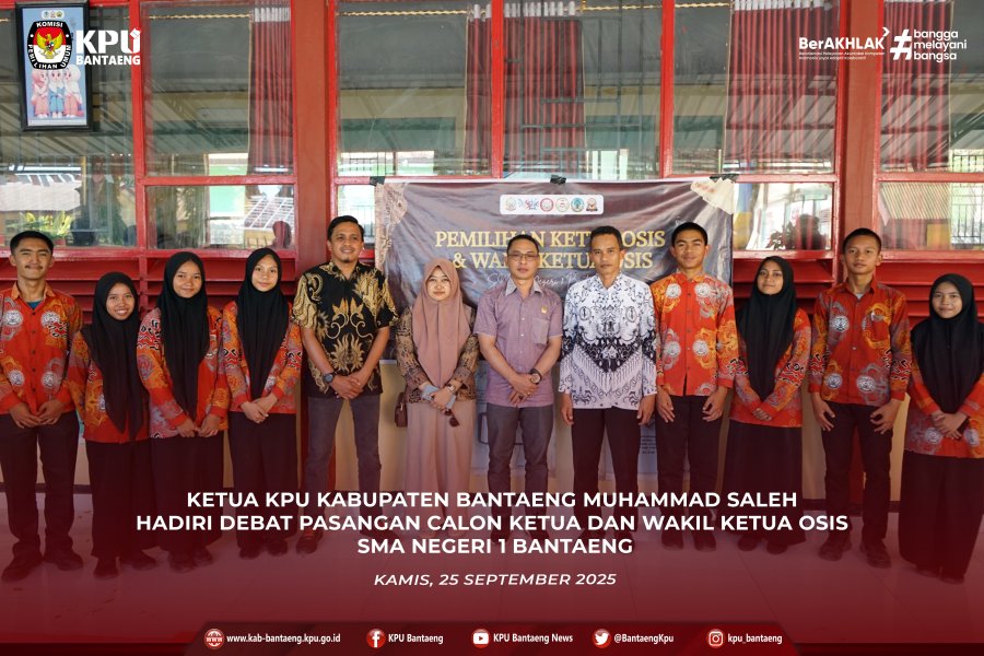Bantaeng,-- Ketua Komisi Pemilihan Umum (KPU) Kabupaten Bantaeng, Muhammad Saleh menghadiri kegiatan debat pasangan calon Pemilihan Ketua Osis (Pilketos) di SMA Negeri 1 Bantaeng, Kamis(25/09/2025) Dalam sambutannya, Muhammad Saleh menyampaikan bahwa Pilketos merupakan ruang pembelajaran politik yang sangat berharga bagi generasi muda. “Pemilihan Ketua OSIS (Pilketos) adalah sebuah miniatur pemilihan kepala daerah (Pilkada) yang berperan penting sebagai pendidikan politik bagi siswa,” ujarnya Ia menjelaskan bahwa salah satu kunci melahirkan pemimpin yang kompeten adalah memastikan calon memiliki kapasitas kepemimpinan yang teruji. “Salah satu syarat untuk memastikan pemimpin yang kompeten, calon Ketua Osis harus memiliki kemampuan kepemimpinan yang teruji. Karena itu, diwajibkan menyertakan sertifikat Latihan Dasar Kepemimpinan (LDK) sebagai salah satu syarat pencalonan,” terang Saleh Muhammad Saleh juga menekankan pentingnya menjaga iklim demokrasi yang sehat selama proses Pilketos berlangsung, khususnya pada momentum debat kandidat. “Saya harap rangkaian kegiatan, khususnya debat kandidat, dapat berjalan sebagai debat yang sehat dan bebas dari segala bentuk intimidasi. Inti dari proses ini adalah membangun sebuah demokrasi yang otentik, bukan demokrasi intervensi,” tegasnya. Kegiatan ini menjadi bagian penting dari rangkaian Pilketos yang diharapkan mampu menanamkan nilai-nilai demokrasi sejak dini kepada para siswa. Diketahui, empat pasangan calon yang beradu visi dan misi serta program yang dicanangkan. Turut Hadir pada kegiatan ini, Anggota Bawaslu Kabupaten Bantaeng Nur Wahni Bersama staf, Kepala Sekolah SMA Negeri 1 Bantaeng, Wahid Hidayat beserta jajaran Guru SMA Negeri 1 Bantaeng. ....