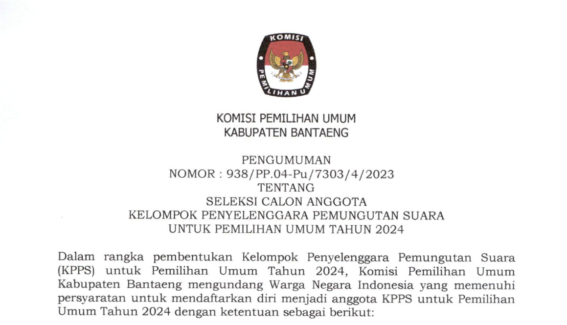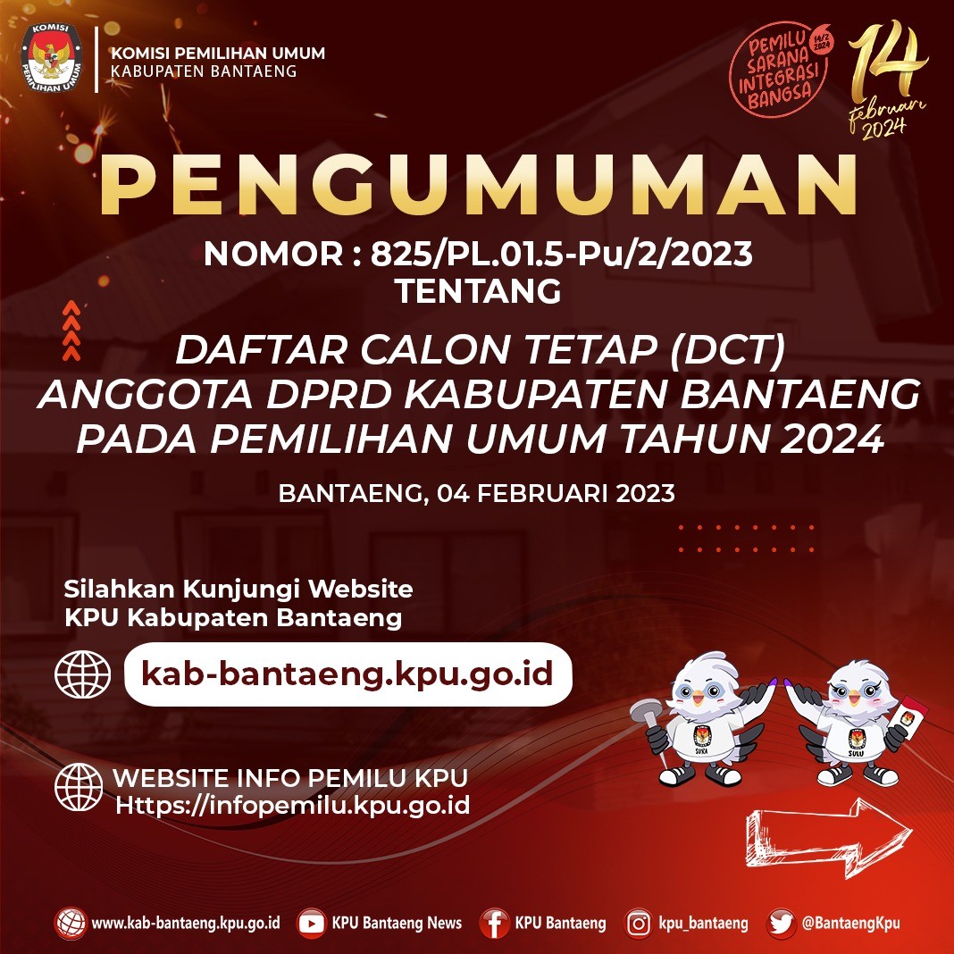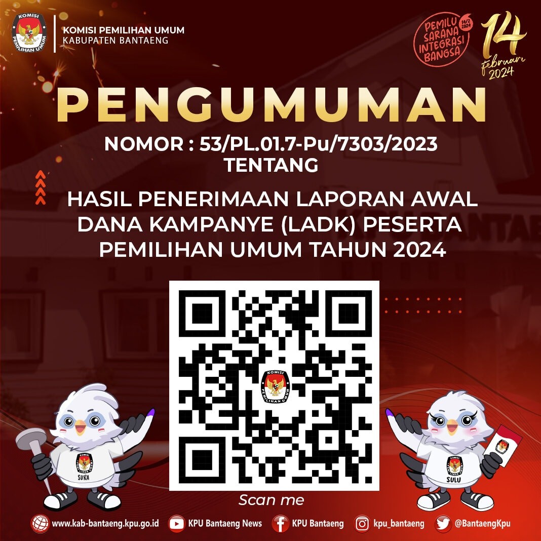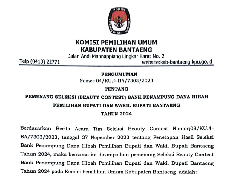 Berdasarkan Berita Acara Tim Seleksi Beauty Contest Nomor:03/KU.4-BA/7303/2023, tanggal 27 Nopember tentang Penetapan Hasil Seleksi Bank Penanmpung Dana Hibah Pemilihan Bupati dan Wakil Bupati Bantaeng Tahun 2024, maka bersama ini disampaikan pemenang Seleksi Beauty Contest Bank Penampung Dana Hibah Pemilihan Bupati dan Wakil Bupati Bantaeng Tahun 2024 pada Komisi Pemilihan Umum Kabupaten Bantaeng adalah: